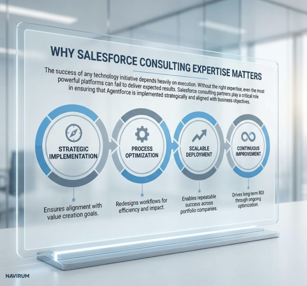 Based on Navirum’s experience with Salesforce and complex operations, here’s how PE firms can ensure Agentforce delivers measurable results across their portfolio: